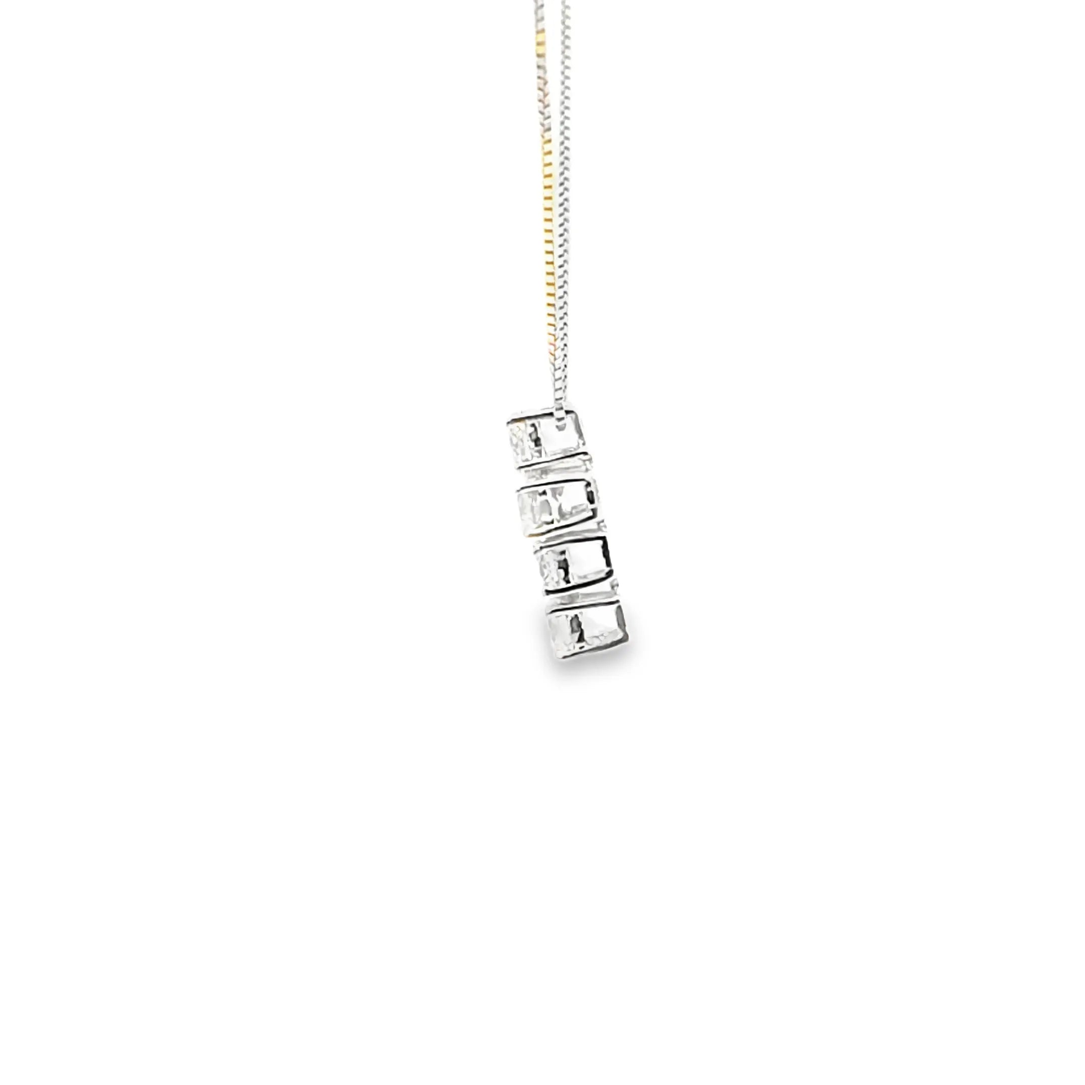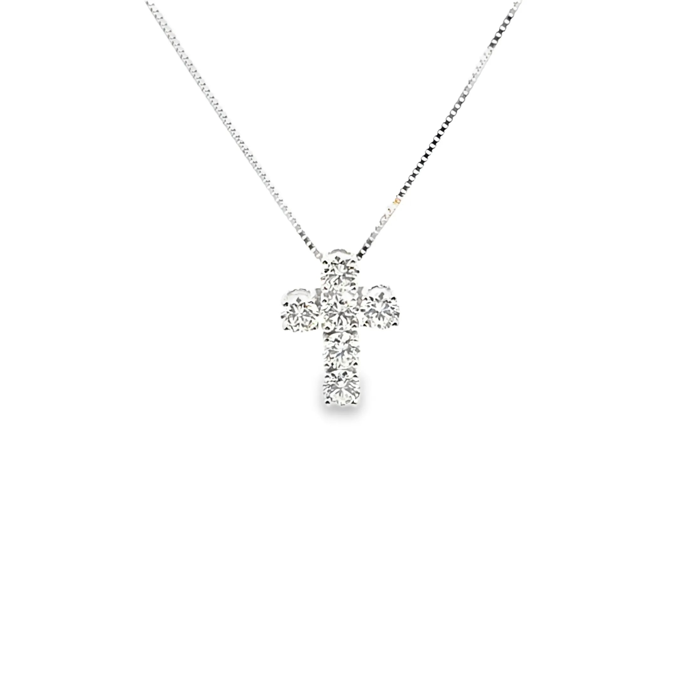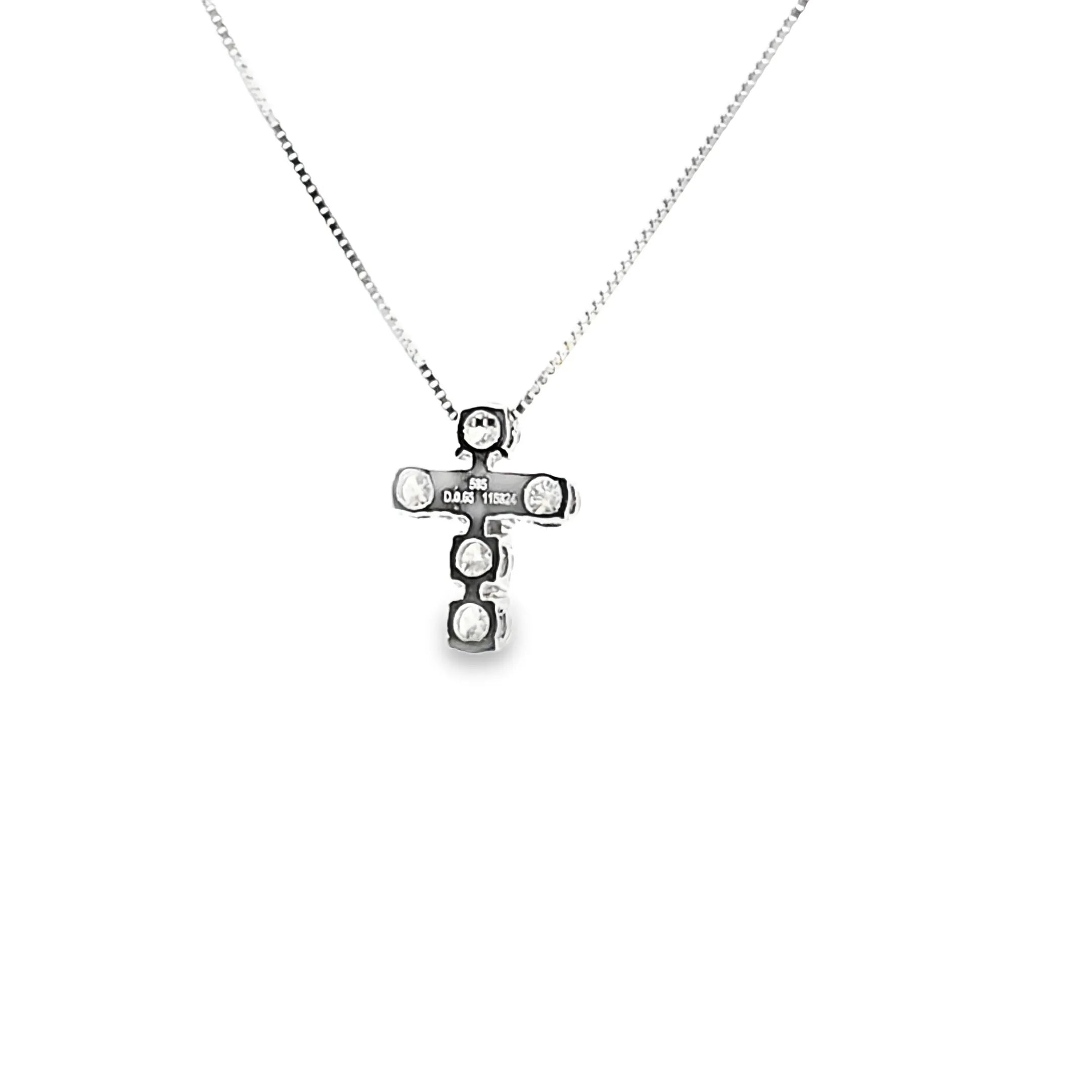 Cruz elegante en oro de 14K con acabado oro blanco, engarzada con un diamante de 0.61 quilates de excepcional brillo. El diseño clásico del símbolo religioso se complementa con una cadena delicada, creando una pieza versátil para uso diario o ceremonial. El diamante certificado añade sofisticación y valor duradero. Ideal para quien busca una joya con significado espiritual y excelencia en craftsmanship.