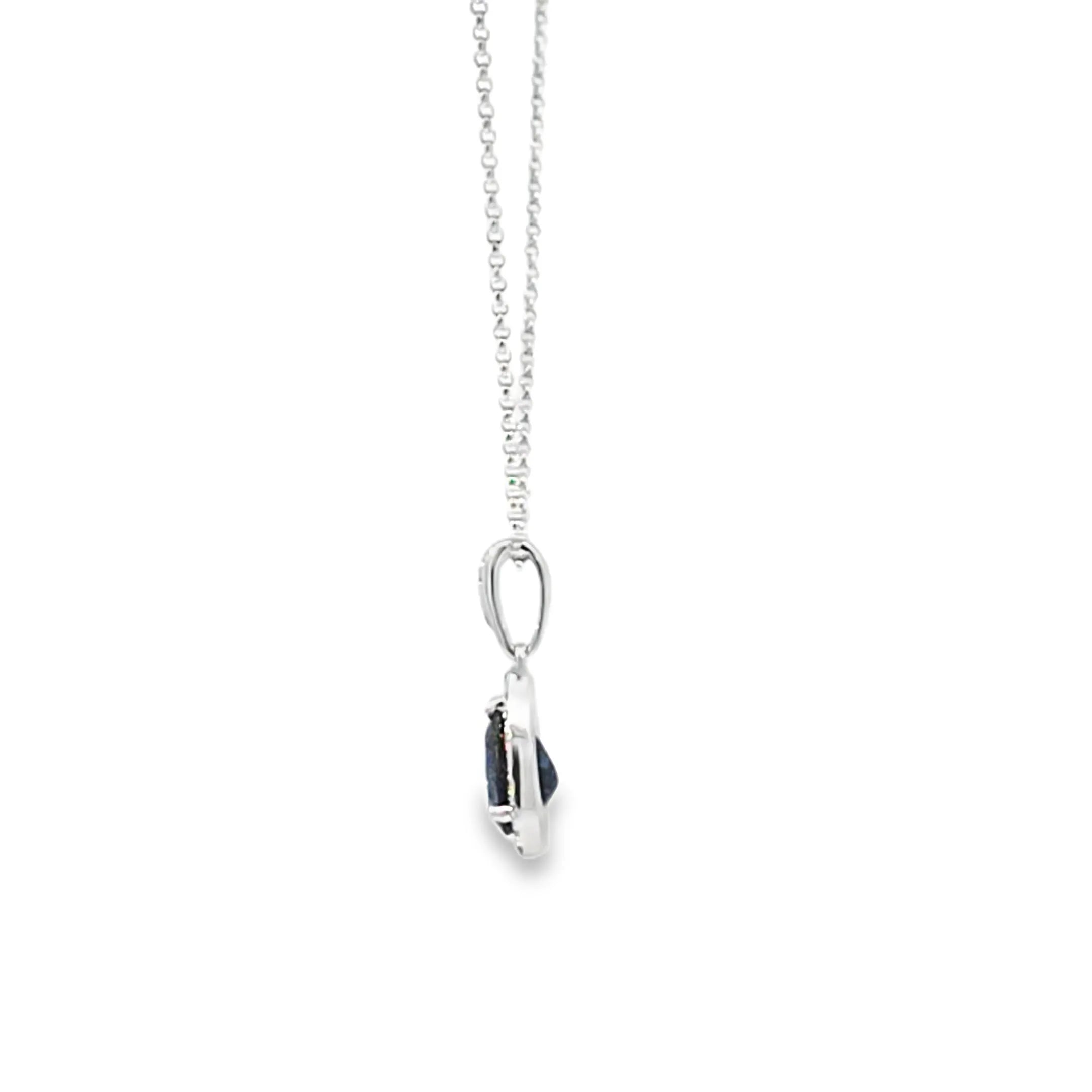 Este dije con cadena está elaborado en oro blanco de 14 quilates, ofreciendo un brillo elegante y duradero. Destaca por su delicado diamante de 0.08 ct, que añade un toque sutil de distinción, y un zafiro de 0.97 ct, que aporta color y profundidad al diseño. Una pieza sofisticada que combina calidad y belleza para quienes buscan una joya exclusiva y refinada.