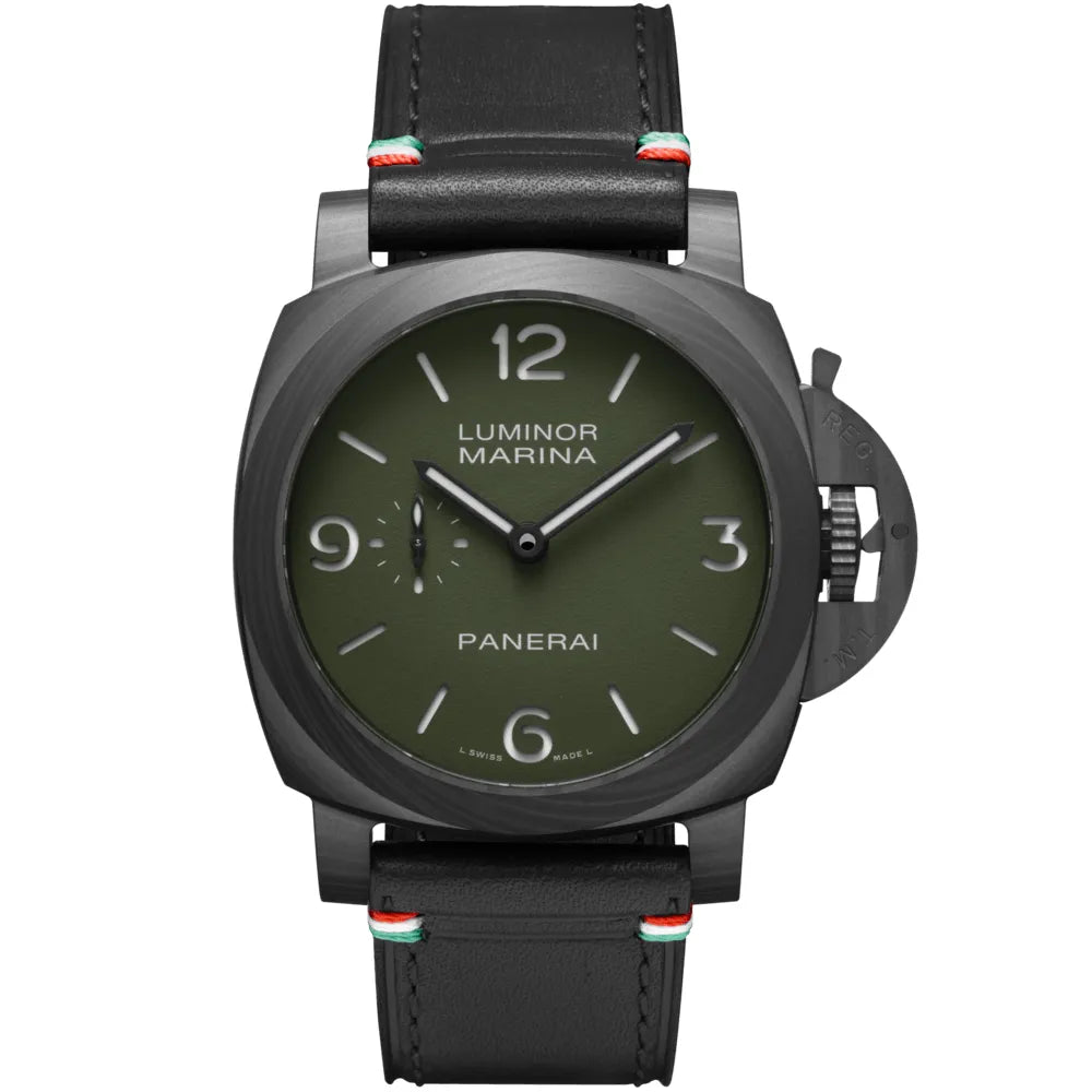 Reloj de pulsera Panerai Luminor fabricado en carbono, movimiento automático de precisión suiza. Caja de 44 mm con esfera negra y agujas luminiscentes para legibilidad en cualquier condición. Correa de cuero auténtico con hebilla de seguridad. Edición especial México con detalles exclusivos. Resistencia al agua hasta 300 metros, ideal para uso diario y aventuras. Cristal de zafiro antirreflejante. Garantía internacional incluida. Un timepiece de colección que combina ingeniería relojera de élite con diseño icónico.